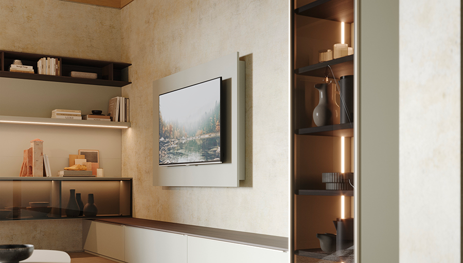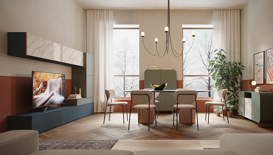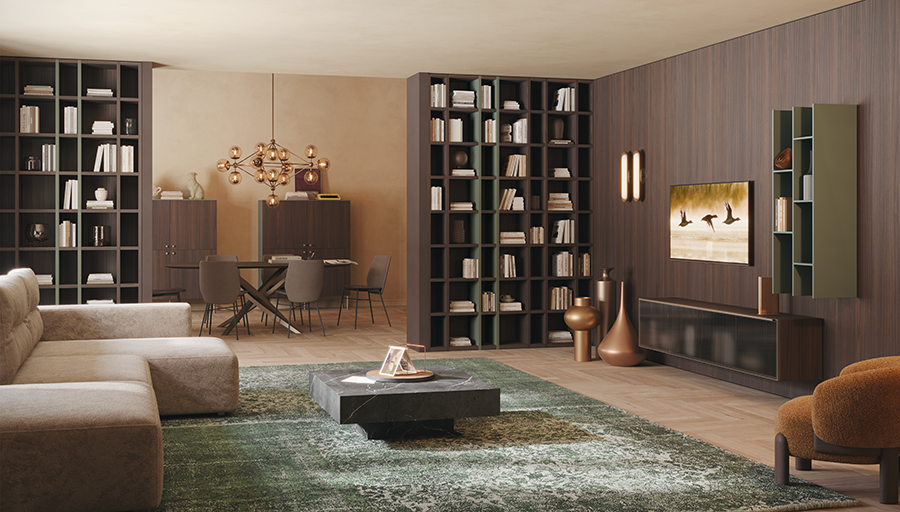 Madie, tavolini, pareti attrezzate e divani dalle proporzioni equilibrate concorrono alla leggerezza visiva, rendendo la stanza armoniosa e ben calibrata. Le linee pulite, inoltre, facilitano la manutenzione e amplificano la sensazione di spazio.