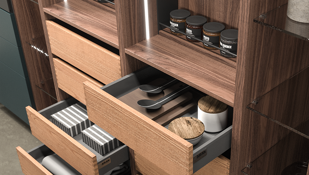 Sostituire i classici ripiani con cassetti estraibili aumenta notevolmente la fruibilità: ogni contenuto è visibile e raggiungibile senza doversi piegare o spostare oggetti.